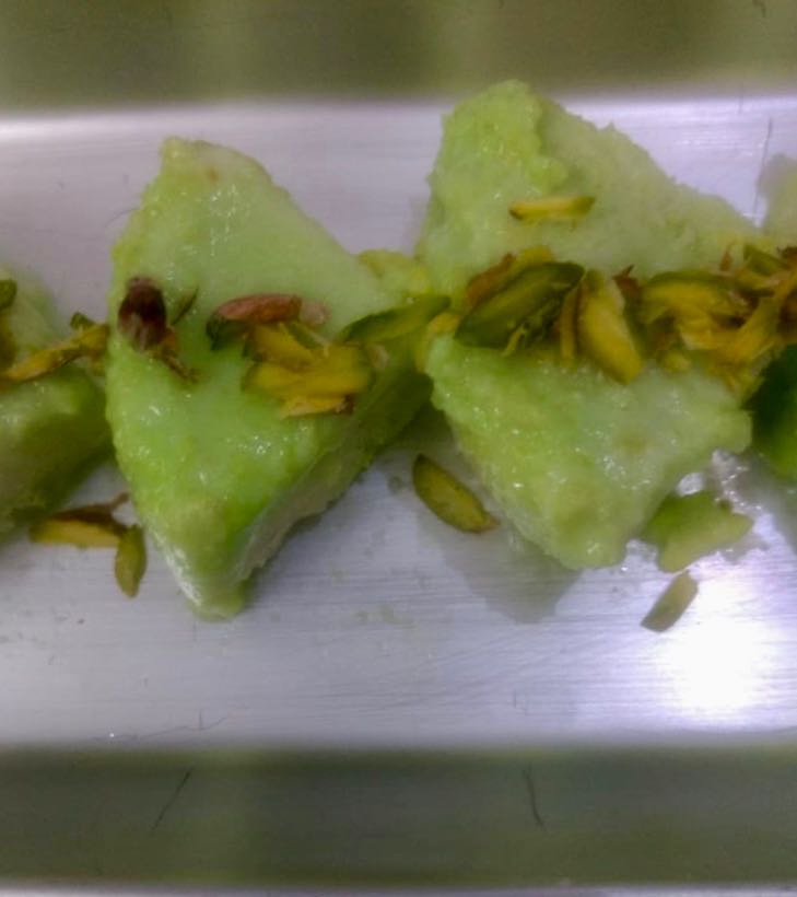 # Allow it to cool down.Then add cream, powder sugar, chopped nuts and pinch of green food colour and dipped puffed rice.